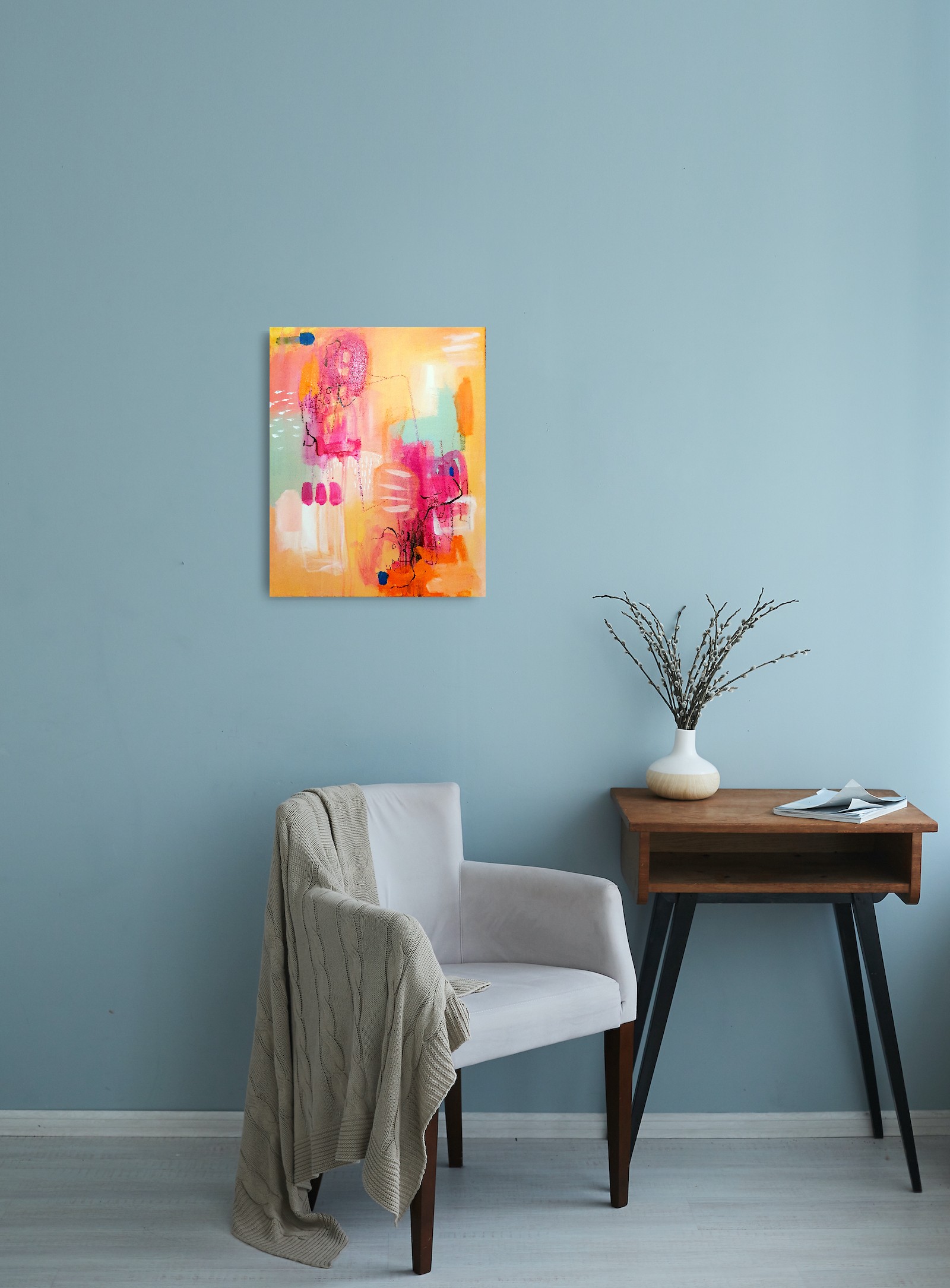 Een abstract schilderij dat een nieuwe weg opende. Nieuwe vormen, nieuwe kleuren, nieuwe expressie. Het oog wordt diagonaal door de compositie geleid, waar het onderweg allerlei zijsprongen tegenkomt. Het frisse teal en de blauwaccenten vormen een tegenhanger voor de warme roze en oranje tinten. Contrast in temperatuur, in helderheid, in vormen, in afmetingen, en in verzadiging.