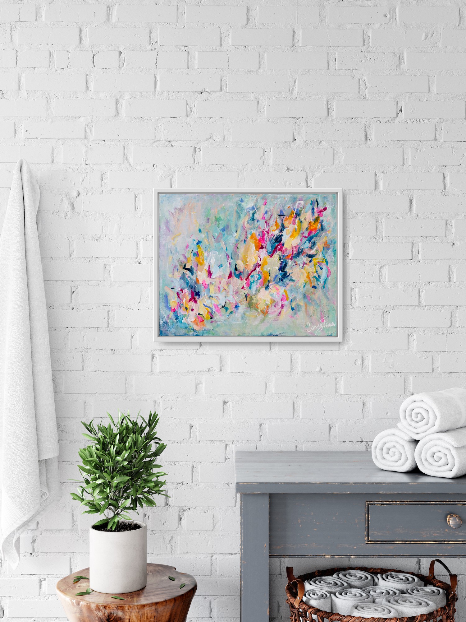 Een abstract boeket van vrolijkheid. Pastelkleurige bloesem in overdaad. Een beweeglijke diagonaal neemt je mee over het doek om je oog vervolgens te laten rusten in de neutrale tinten aan de rand van het canvas.