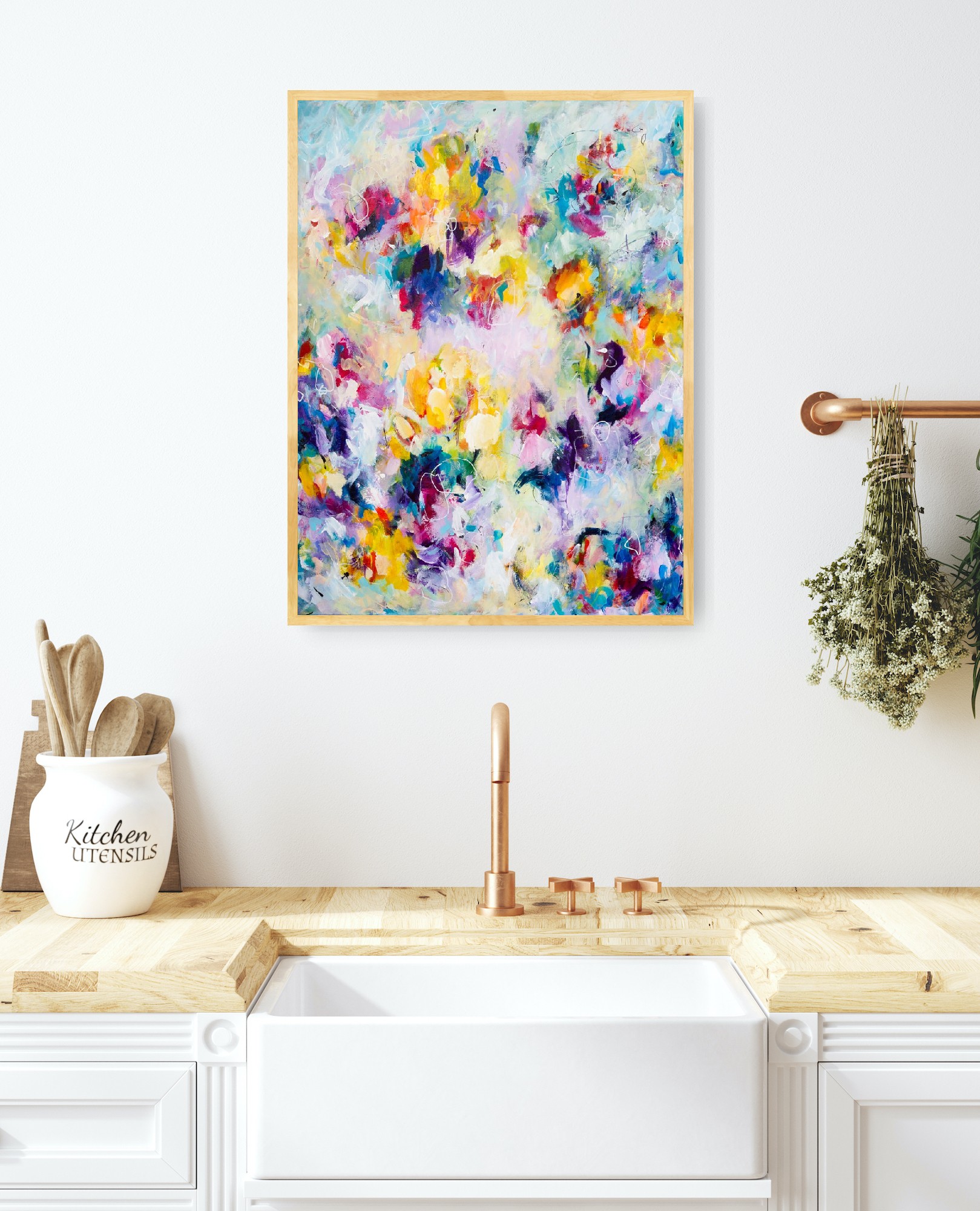 Een abstract schilderij dat een ongedwongen sfeer oproept. Een gevoel van buiten zijn, van bloemen, van genieten. Als een picknick waar je even naar toe kunt gaan om te ontspannen.