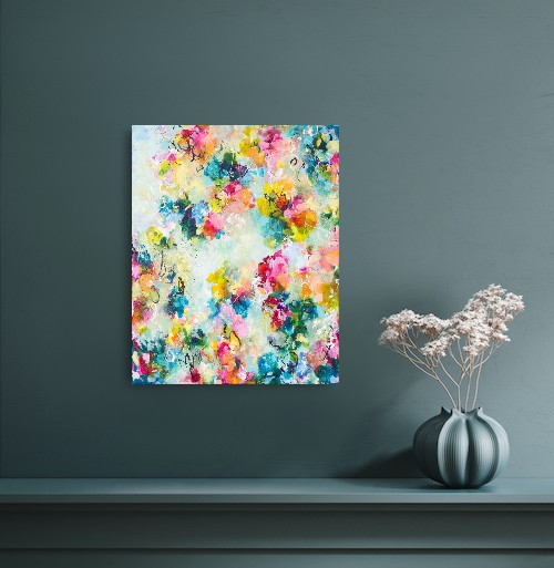 'Between Blossoms and Butterflies' vormt een mooie combinatie met schilderij 'Where Dreams and Roses Grow'. Je waant je in een overdadig bloemrijk landschap, waar de bloesems en vlinders in één kleurenpracht elkaar afwisselen.