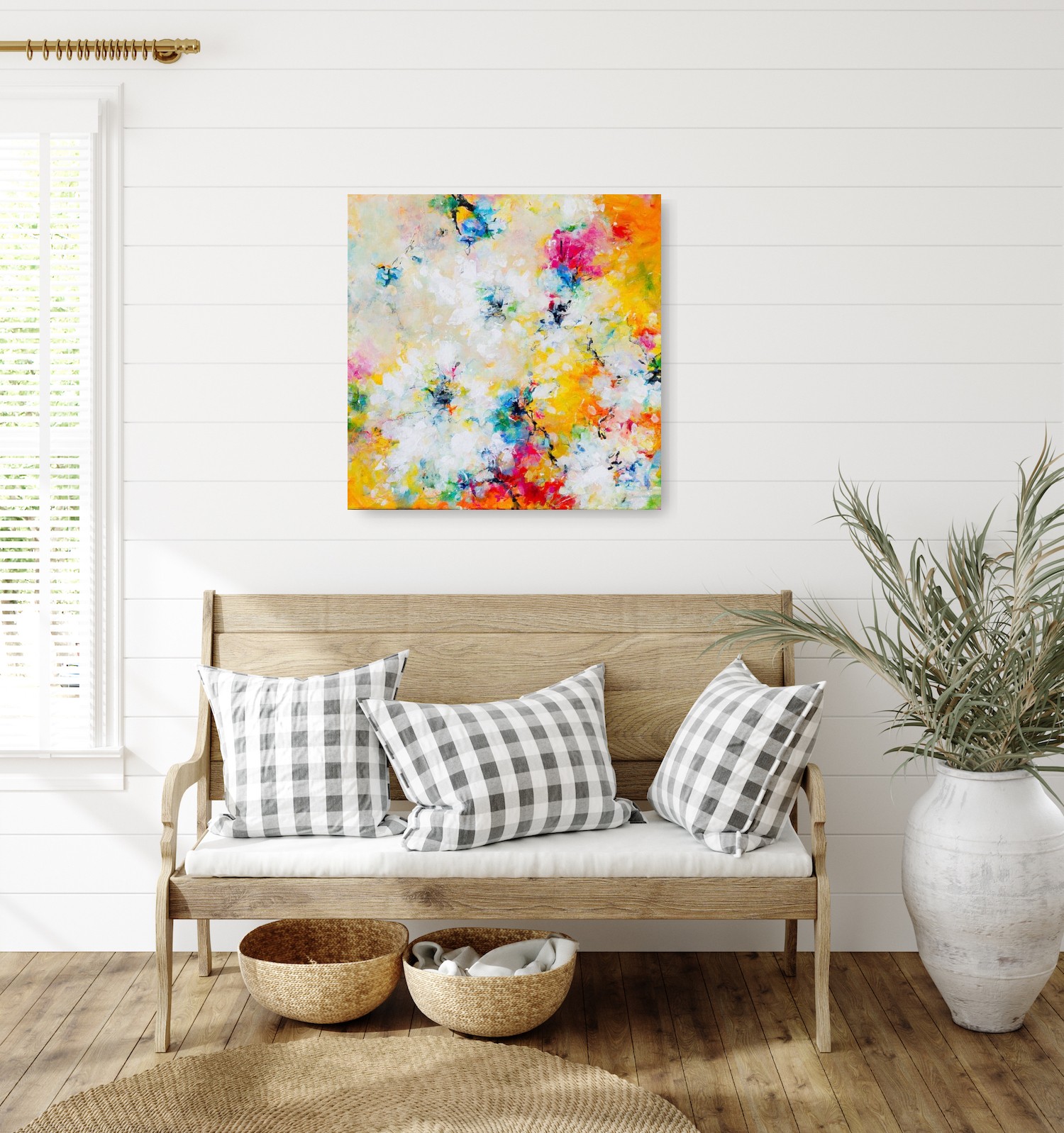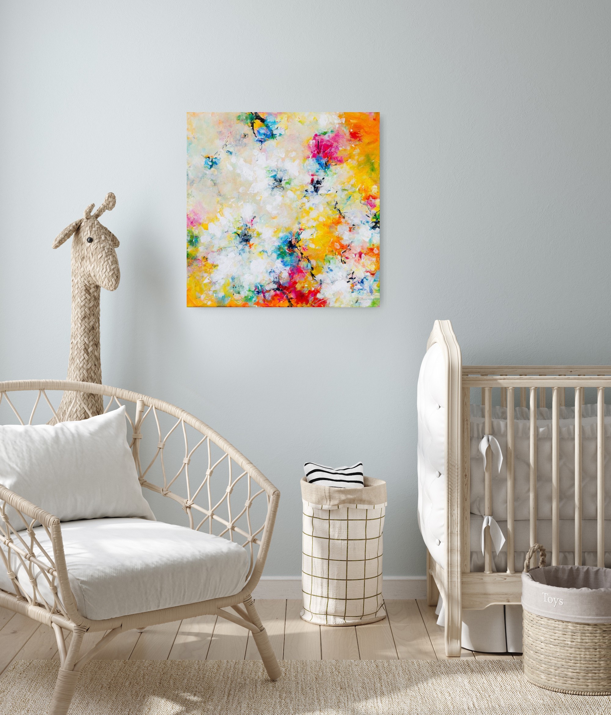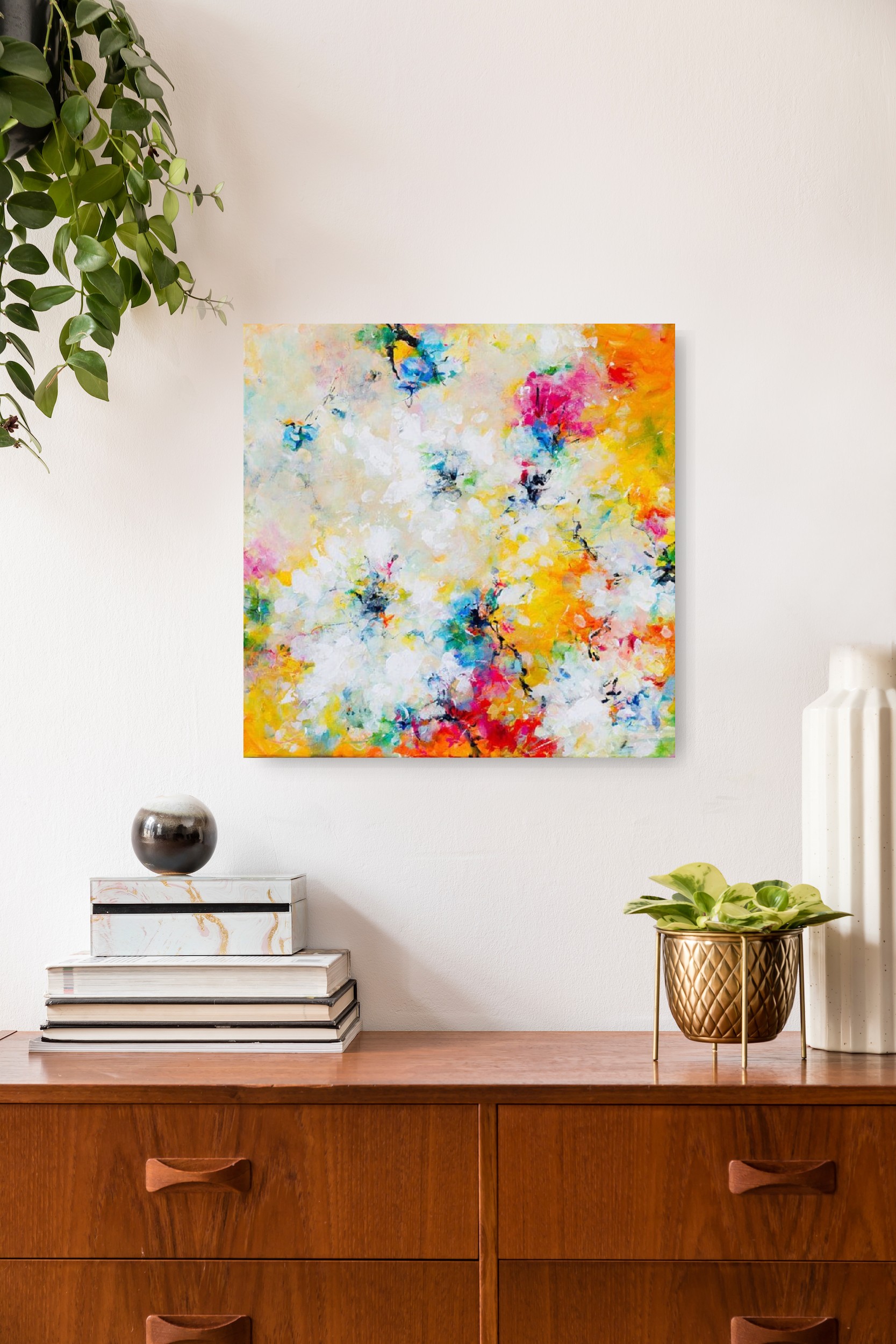 Dit kleurrijke schilderij is tegelijk krachtig en zacht. Volle kleuren geven een warme zonnige sfeer, terwijl de tere vage contouren van bloemen het beeld een kwetsbare uitstraling geven. Laat je oog erin ronddwalen en proef de zomer.