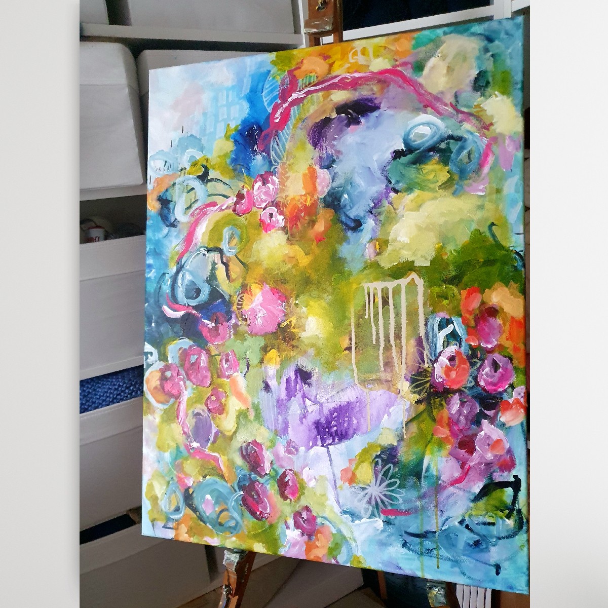 'Eden's Night Out' is een feestje. In dit abstracte kleurrijke schilderij vind je een overdadig spel van kleur, een wervelwind van vormen. De lijnen zwepen je op en nemen je mee in dit feestelijke schilderspektakel, waarin je overvloed proeft. Zoete geuren ruikt. Verfrist wordt door sprankelend water en zachte velden. Een energiek abstract werk voor permanente vrolijkheid in huis.Eden's Night Out is gemaakt met acrylverf op een 60*80cm canvas.