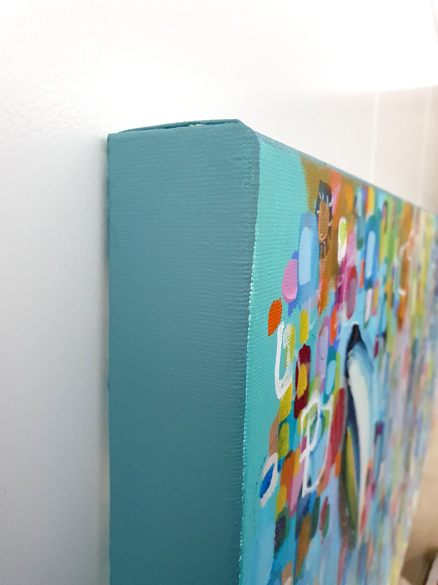 De zijkanten van het schilderij zijn in een effen vergrijsd blauwe kleur geschilderd.