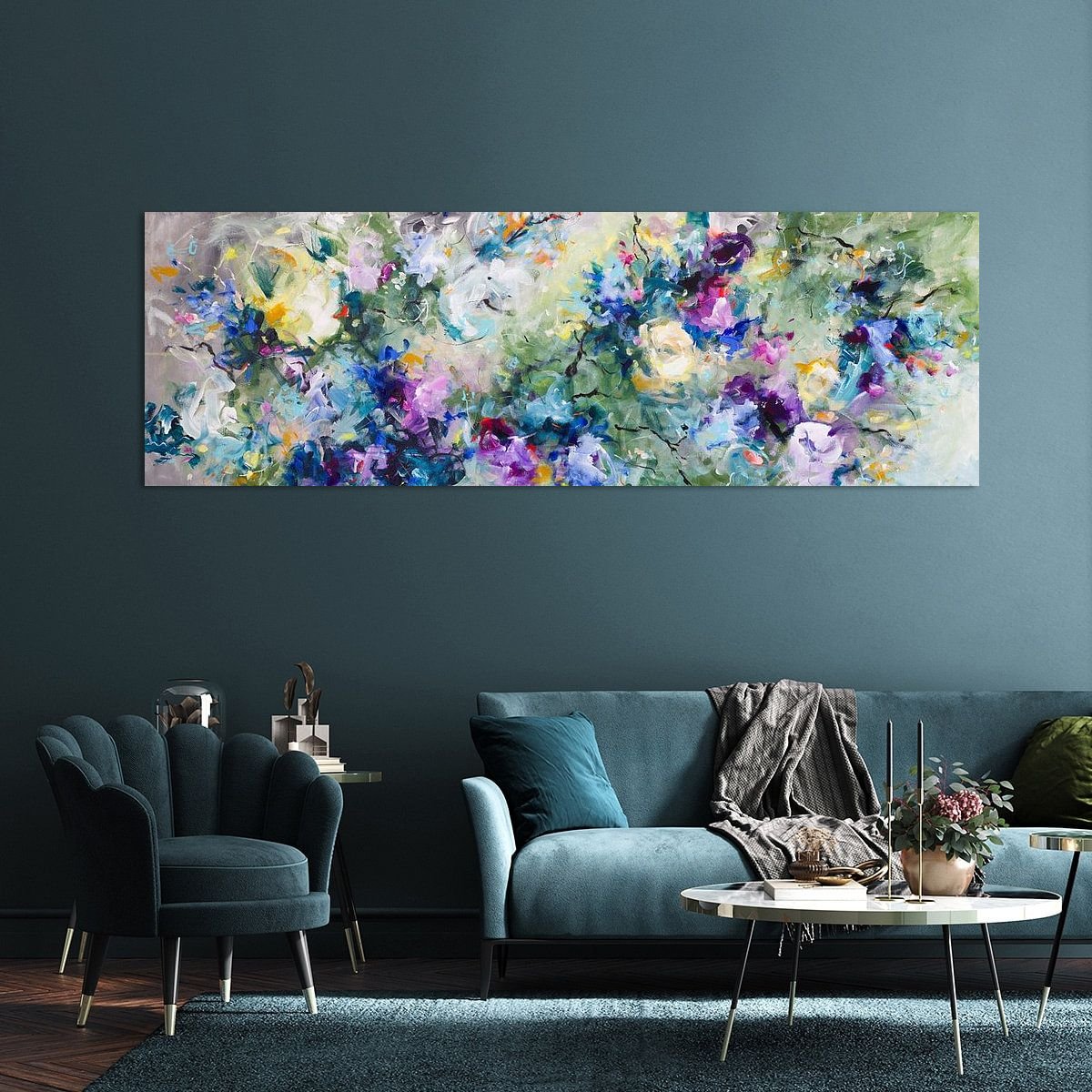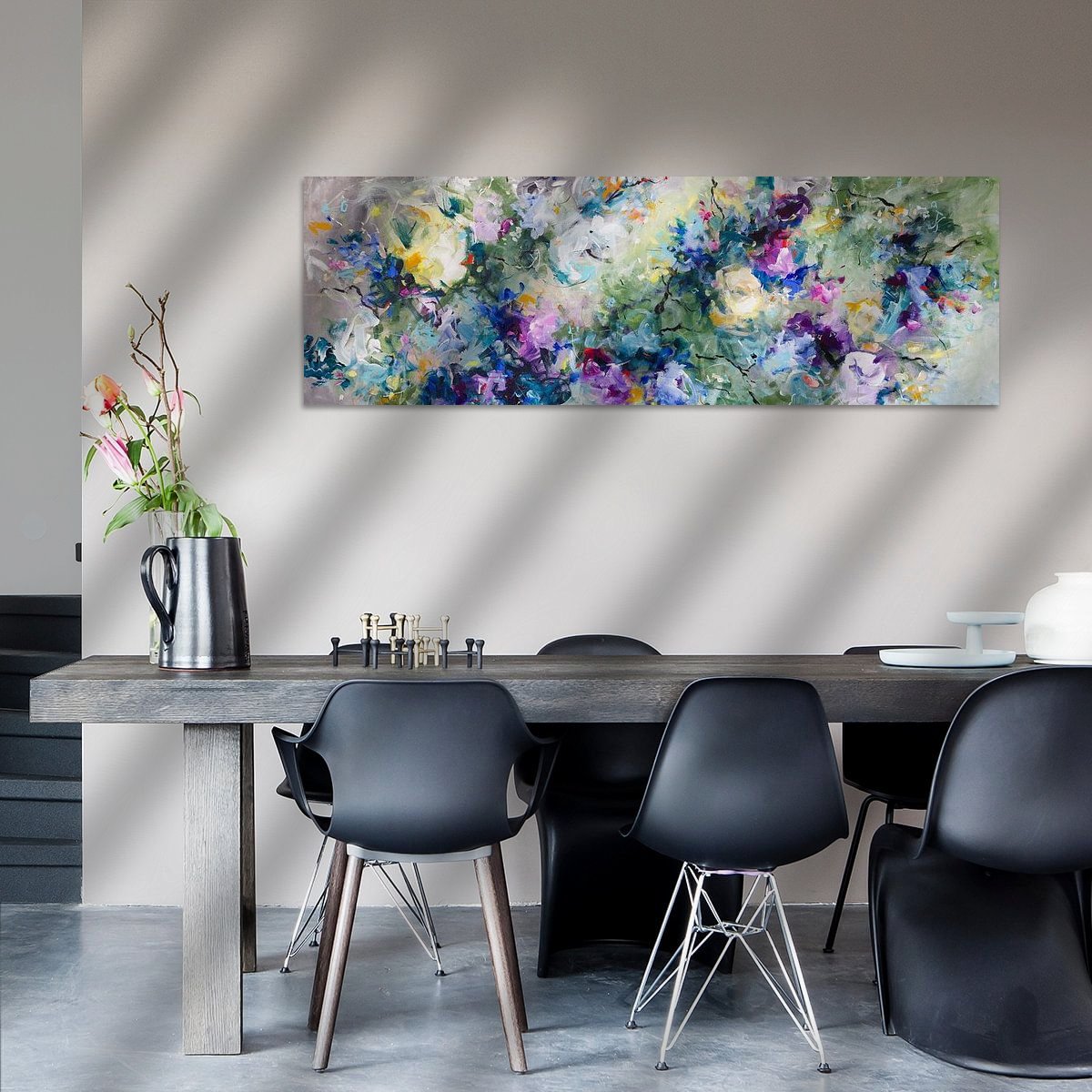 Weer een wervelend bloemachtig doek is verschenen bij het intuïtief schilderen. Dit frisse panoramabeeld heeft een zacht palet van koele kleuren met warme accenten en grillige lijnen die je oog door de compositie leiden.